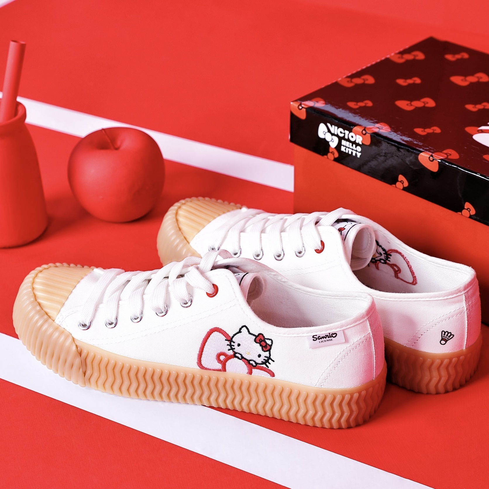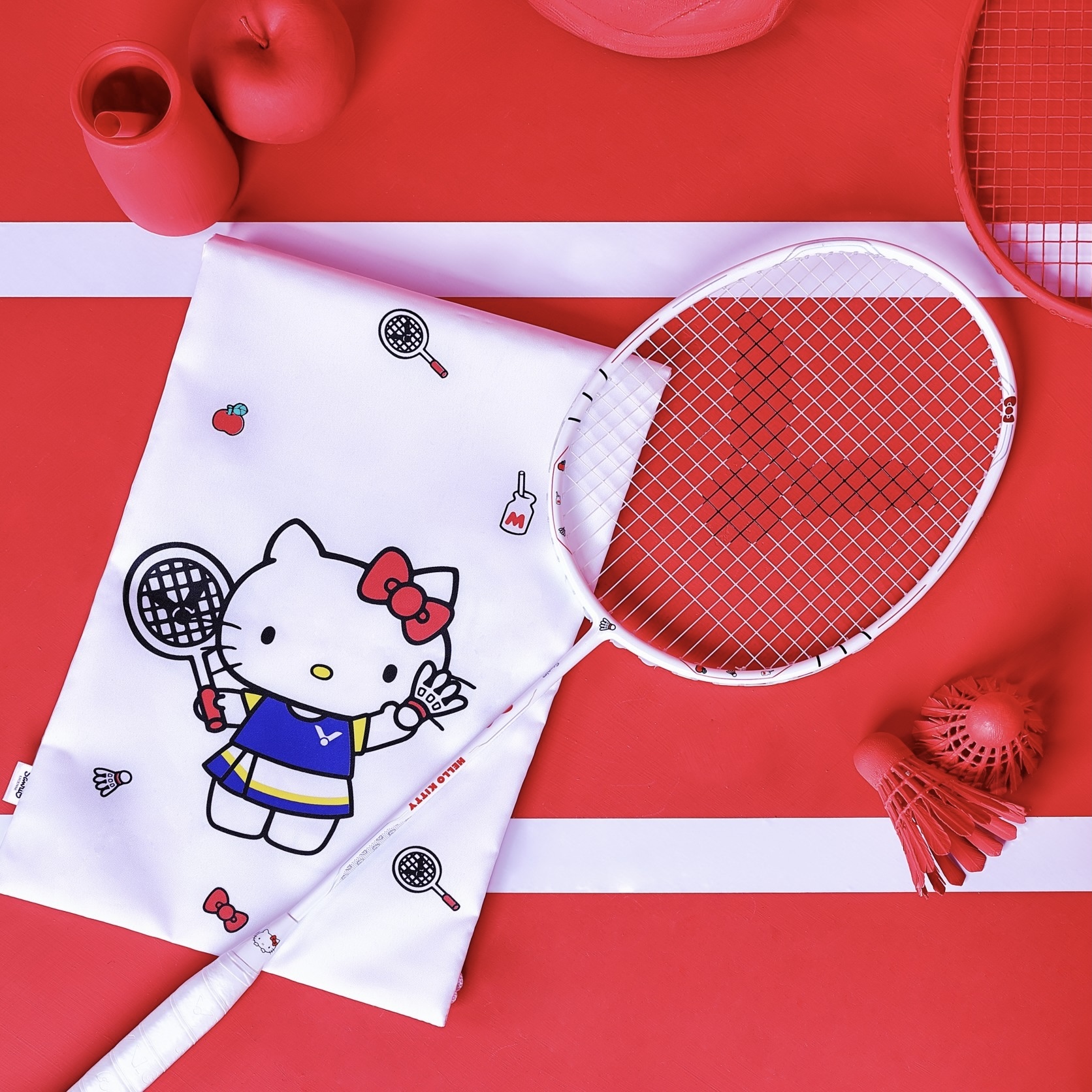 Sản phẩm liên doanh VICTOR x HELLO KITTY kết hợp khéo léo nơ, bình sữa, quả táo và các thiết kế khác của HELLO KITTY cổ điển.